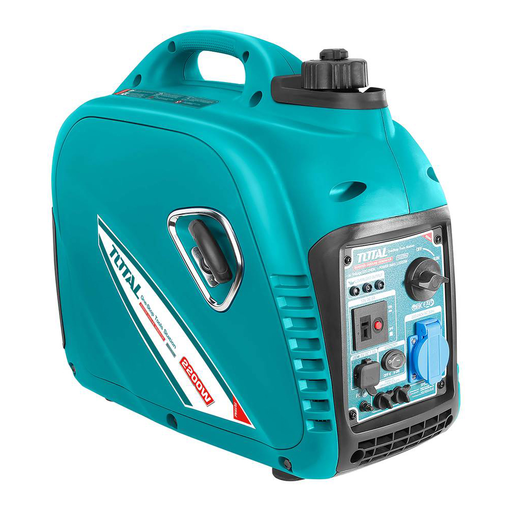 - Небольшой инверторный (на выходе – «чистая синусоида»)генератор TOTAL номинальной мощностью 2,0 кВт- универсальный вариант как для обеспечения аварийного электроснабжения на даче, так и для организации питания приборов на выездном отдыхе. В случае небольшой загрузки можно перевести станцию на режим экономичной работы и значительно снизить расход топлива.